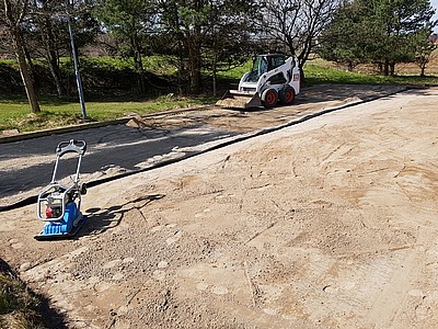 Den gamla sargen togs bort och den 300 kvm stora ytan hyvlades av och överskotts materialet användes till att fylla ut håligheterna på konstgräsvallen. Därefter sattes en ny sargen, ytan paddades och en fiberduk rullades ut. Cirka 40 ton nytt material i form av stenmjöl etablerades, jämnades av och paddades än en gång.